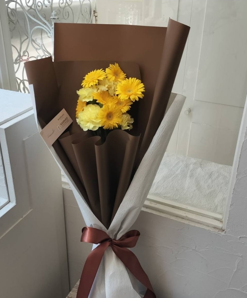 NO8208 | 花束 | "リピーターさんがいつもこだわりを持って長さや紙の色や花のリクエストを前例写真を参考におっしゃる 今回は茶色の中敷きご希望で" | ||