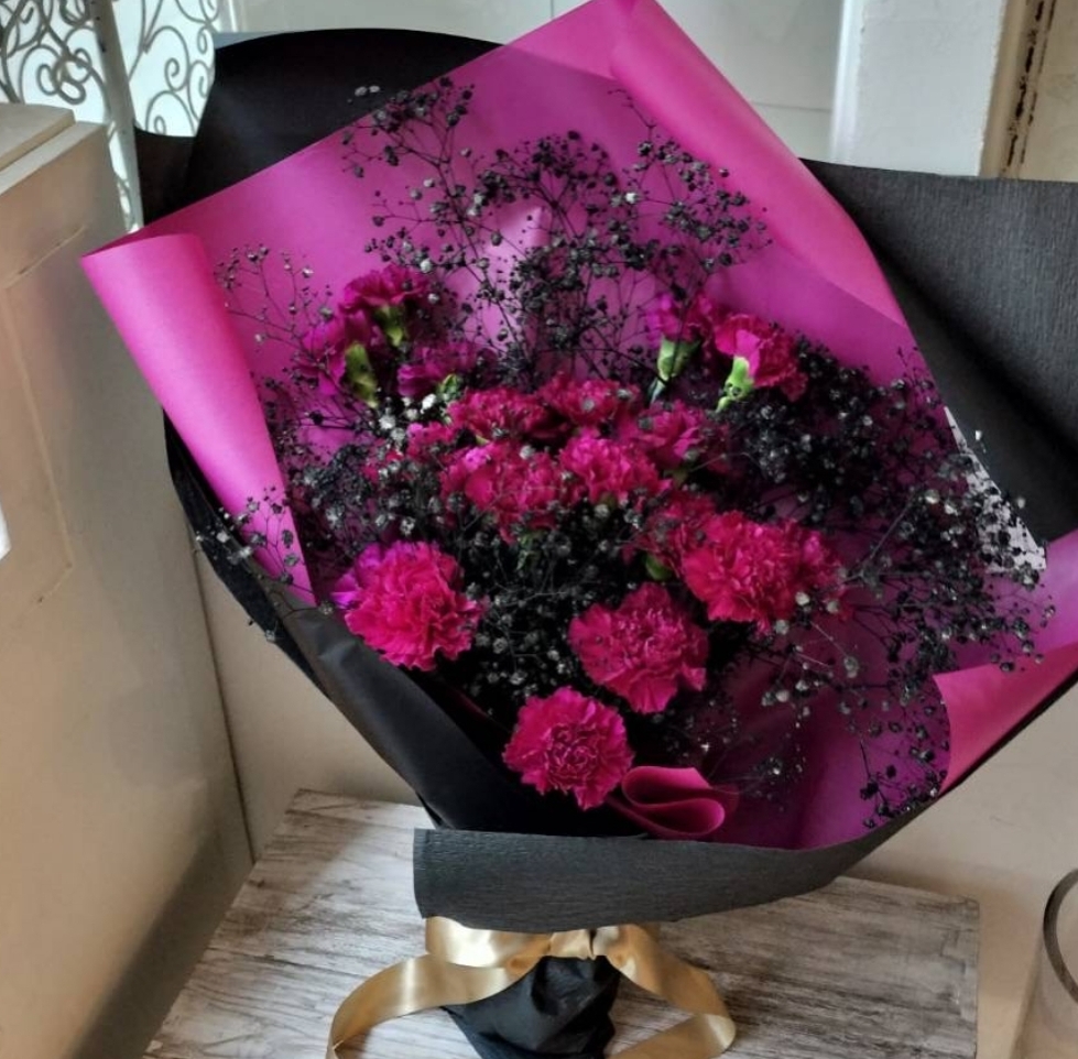 NO8232 | 花束 | 黒のかすみ草とショッキングピンクのカーネーションの花束のリスエスト | ||