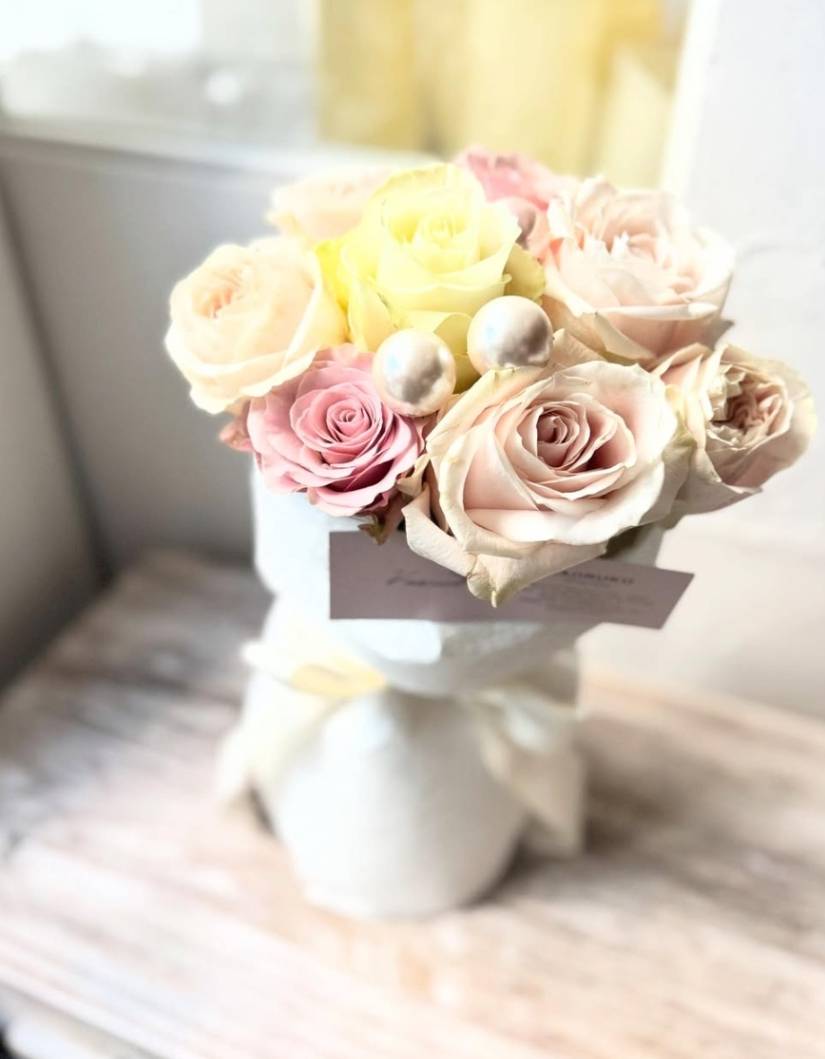 | NO5741 | 花束 | いちごミルク色のお花たちを束ねてリボンの代わりにパールで |